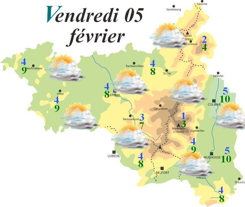 ► SAMEDI : Grande douceur dans une ambiance ventilée. Poussée par un vent de sud-ouest à 60-70km/h en rafales en plaine, les 10°C seront dépassés. Les passages ensoleillés pourront être assez généreux par moment.