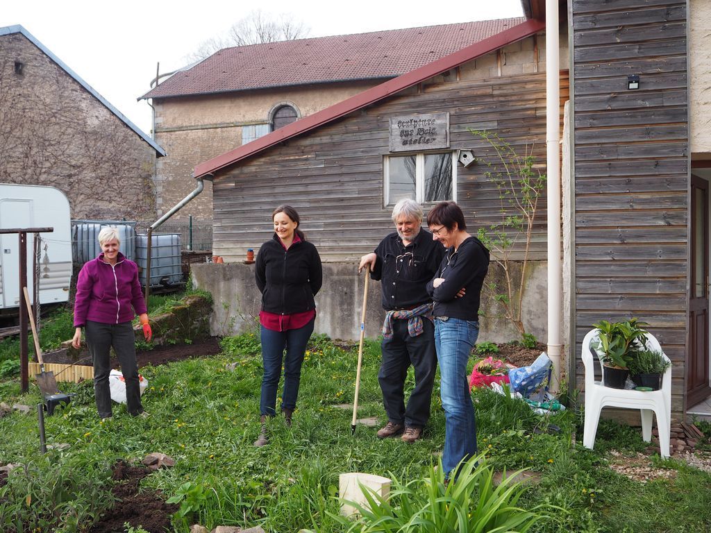 Gabriel profitait de l'éclaircie de jeudi pour faire quelques plantations. Evelyne, Gerlinde, Adeline, et Julian tout passionnés de jardinage sont venus parler boutique avec lui.
