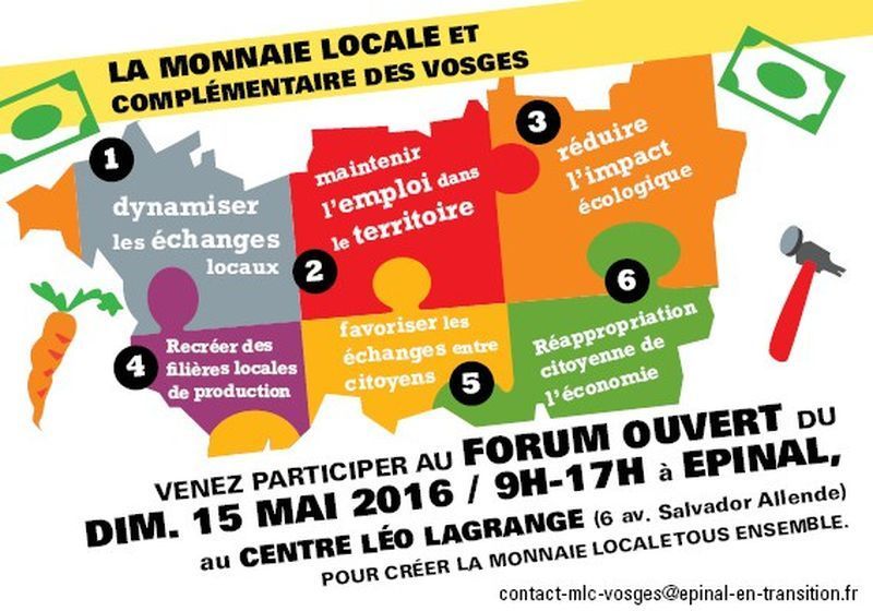 A l’instar du projet nancéien, Un Collectif d’associations Vosgiennes* se réunit sur ce sujet depuis août et tente de poser les premières pierres d’une future monnaie locale complémentaire citoyenne et solidaire pour les Vosges. Pour ouvrir dès aujourd’hui la réflexion et permettre l’implication de chacun d’entre nous, il nous propose de venir échanger sur ce vaste sujet lors d’un Forum Ouvert* !