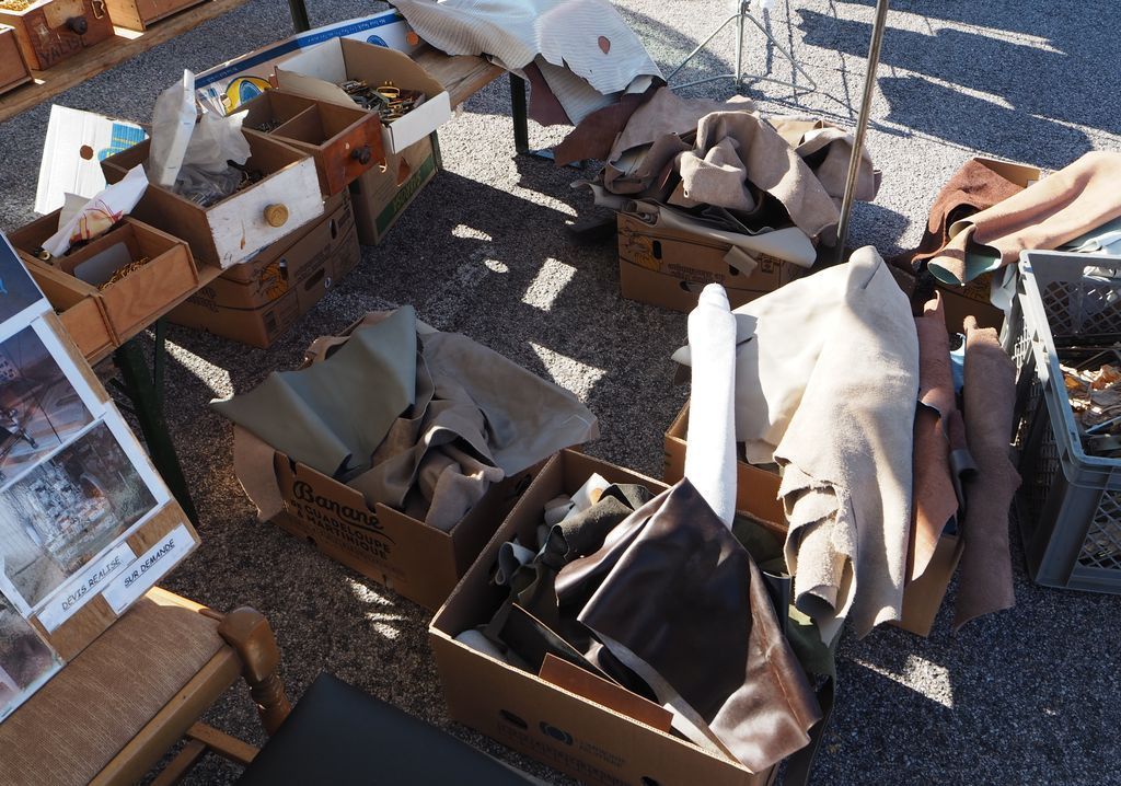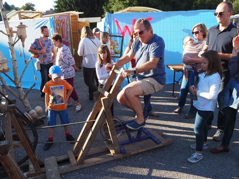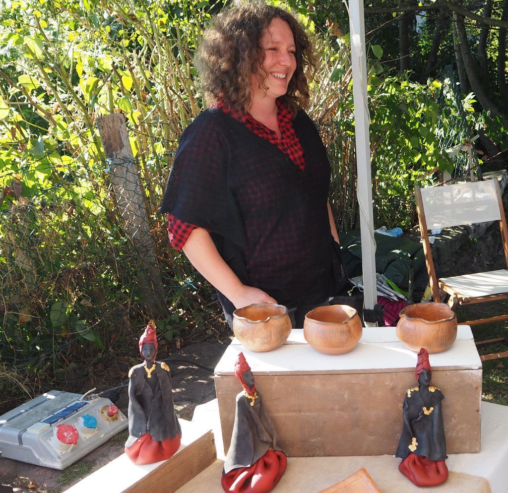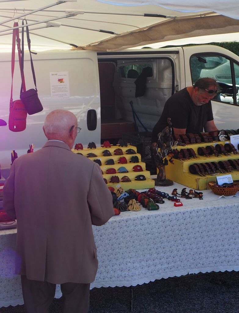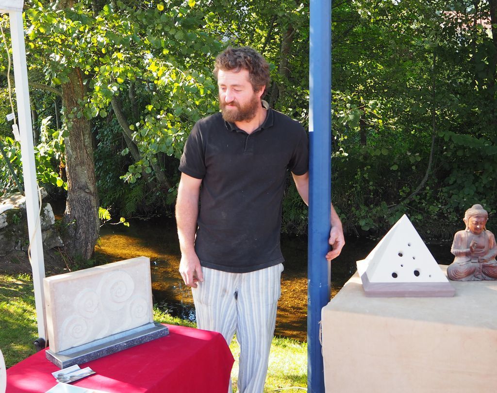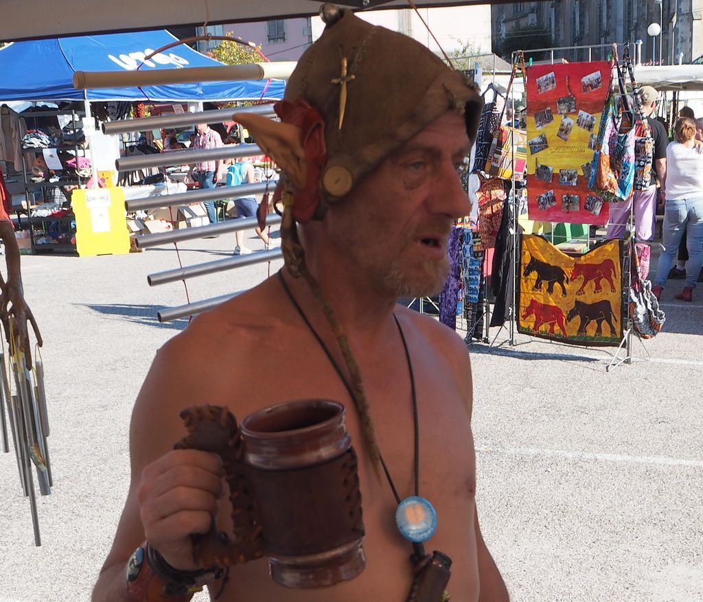 C'est notre artisan, travailleur du cuir, fétiche. Nous l'avons connu l'an dernier au Festival de la Transition d'ici. Depuis chaque rencontre est l'occasion d'une séance de pose. Il présente sa chope de bière, de la belle ouvrage. J'ai oublié de lui demander si cette ornementation façon Viking pouvait aussi servir pour les cranes des ennemis tués au combat. Faut se renseigner, çà peut toujours servir.