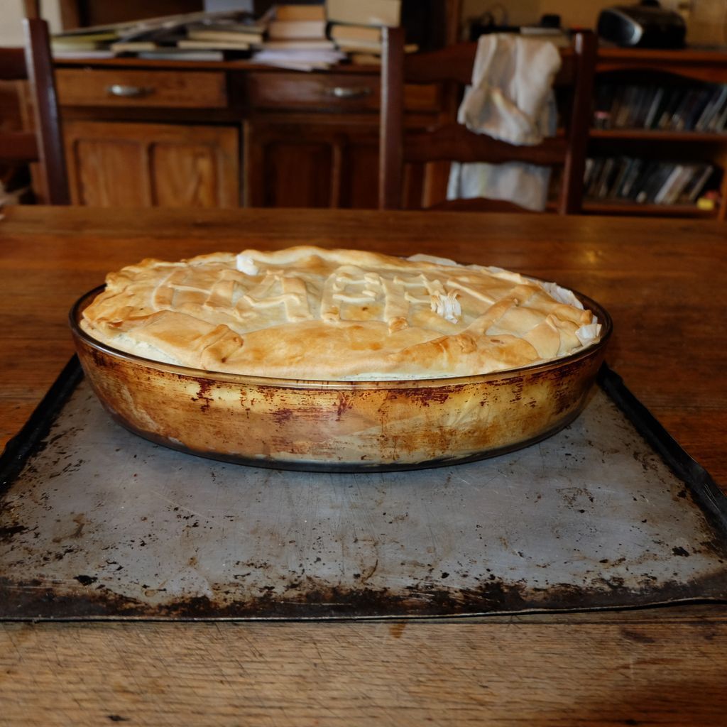 Je viens de cuire une tourte et vais la réchauffer afin qu'elle soit plus goûtante. C'est la seule chose que je sais cuisiner. Enfin c'est mangeable. Sans fausse modestie, je dirais même que c'est une tourte qui concurrencerait sans problèmes les fouaces pour lesquelles une Guerre Pichroline fut déclarée.