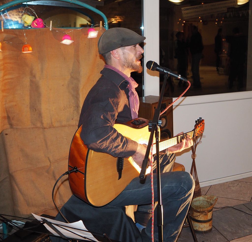 Entre une dégustation de soupe aux légumes de Francis, un échange avec Les Jardins en Terrasses sur leur travail, leur engagement et l'utilité des Chantiers d'Insertion, quelques prises de photos des tables magnifiquement décorées de plats, assiettes, faitouts, soupières, panières, compotiers et saladiers, entre un bol de soupe aux champignons enrichie de morceaux de pain de campagne trempés dedans, une bouchée de rillettes ou une tranche de pâté accompagnés de salade diverses, il y eut des moments où, je le confesse, quelques couplets m'échappèrent, quelques accords de guitare n'arrivèrent pas jusqu'à moi.