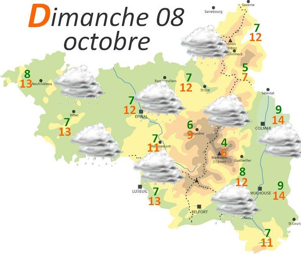 Demain dimanche, la grisaille reste opaque du matin au soir. Seule plaine d'Alsace centrale, foehnée, restera au sec mais les espoirs d'éclaircies resteront faibles. Ailleurs, ce sont des pluies faibles à modérées et intermittentes qui nous accompagneront tout au long de la journée. Les températures maximales en seront réduits à un niveau de début novembre. Le vent restera cependant discret.