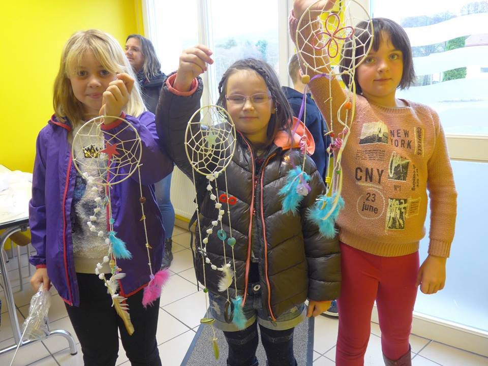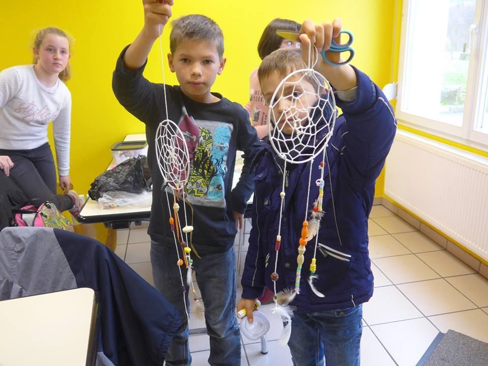 De tradition amérindienne, l'attrape rêves.capture tous les rêves et au matin le soleil efface tous les cauchemars. Comme nos petits bricoleurs n'aiment pas les mauvais rêves, ils ont confectionné avec application leur attrape rêves en y accrochant les perles, plumes... qu'ils avaient apportées.