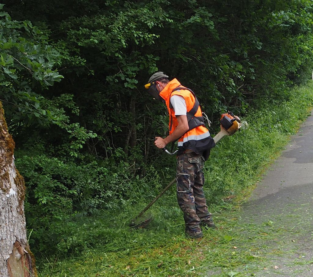 Dés 8 h 30 du matin, 4 salariés commençaient de nettoyer avec leurs débroussailleuses les espaces entre les arbres et les portions de talus les plus accidentées. Derrière eux, une personne dégageait au fur et à mesure la route de tous les débris d'herbes pour éviter qu'ils ne restent collés au revêtement. Une autre coupait les branches d'arbres qui risquaient de gêner les usagers.