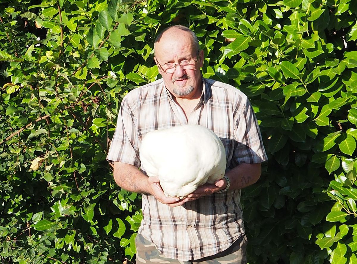 La sécheresse persistante du mois de septembre ne favorise pas la pousse des champignons. Pour le moment les cèpes sont encore très rares. Pourtant Jean-Louis Demange fait partie de ces mycologues avertis qui ne reviennent jamais bredouilles quel que soit le temps ou la saison. Il vient ainsi de trouver un magnifique Lycoperdon ou vesse de loup géante. Même si ce n'est pas un record, celui-ci pèse 3 780 grammes pour un diamètre de 42 cm. Il va le déguster coupé en tranches qu'il cuira à la poêle accompagnées d'un peu d'huile, d'ail, de sel et de poivre. Cette variété pousse dans les prairies et dans les friches. En presque 50 ans de récolte, c'est seulement la troisième fois qu'il en trouve un.