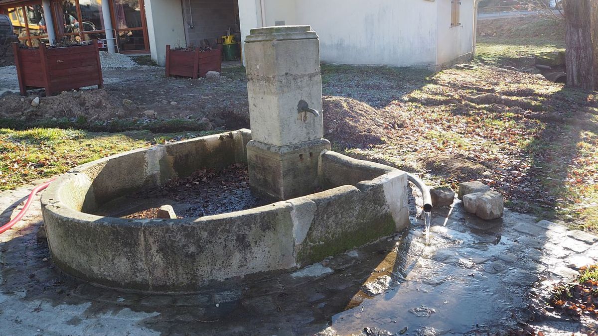 Il ne manquait plus qu'une seule chose : la mise en eau de cette fontaine. Maintenant c'est fait ou du moins des canalisations captant l'ancienne source ont été posées et il ne reste plus qu'à faire le raccordement pour que les auges se remplissent.