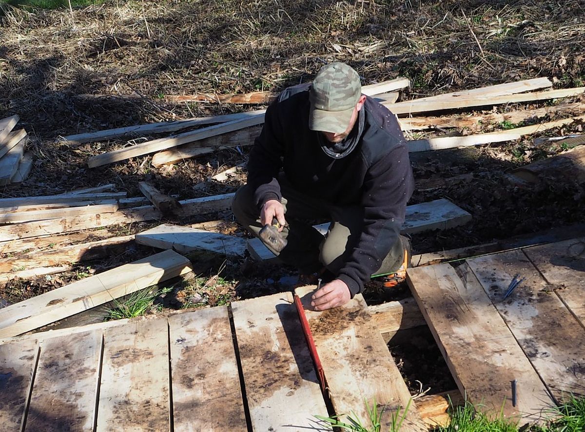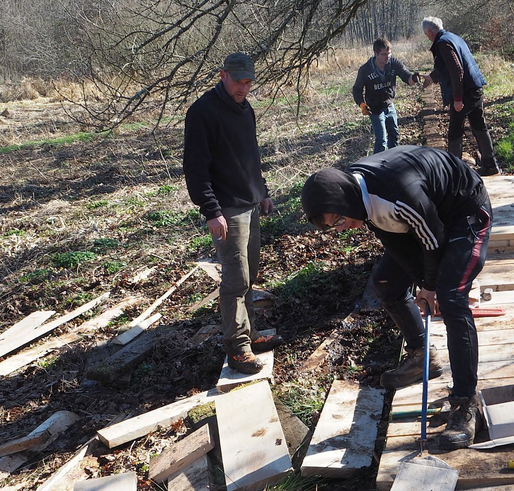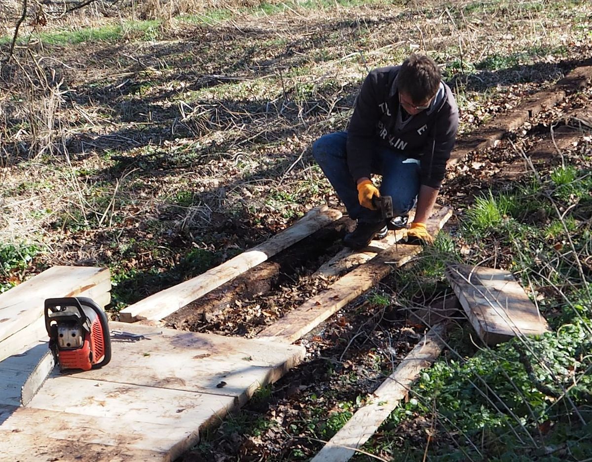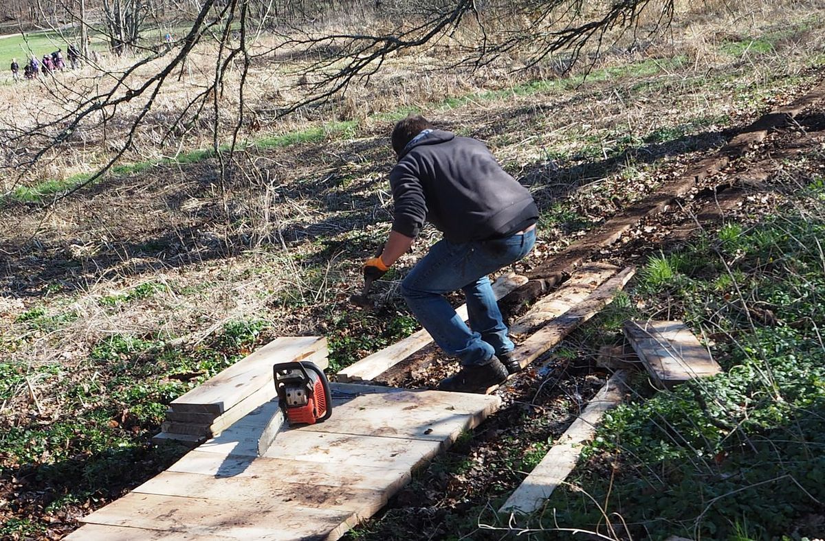 Cette semaine le chantier d'insertion refait à neuf toute une section. Un chêne abattu par les salariés a été débité en belles planches de 4 cm d'épaisseur. Elles serviront à remplacer les anciennes qui ont été ôtées.