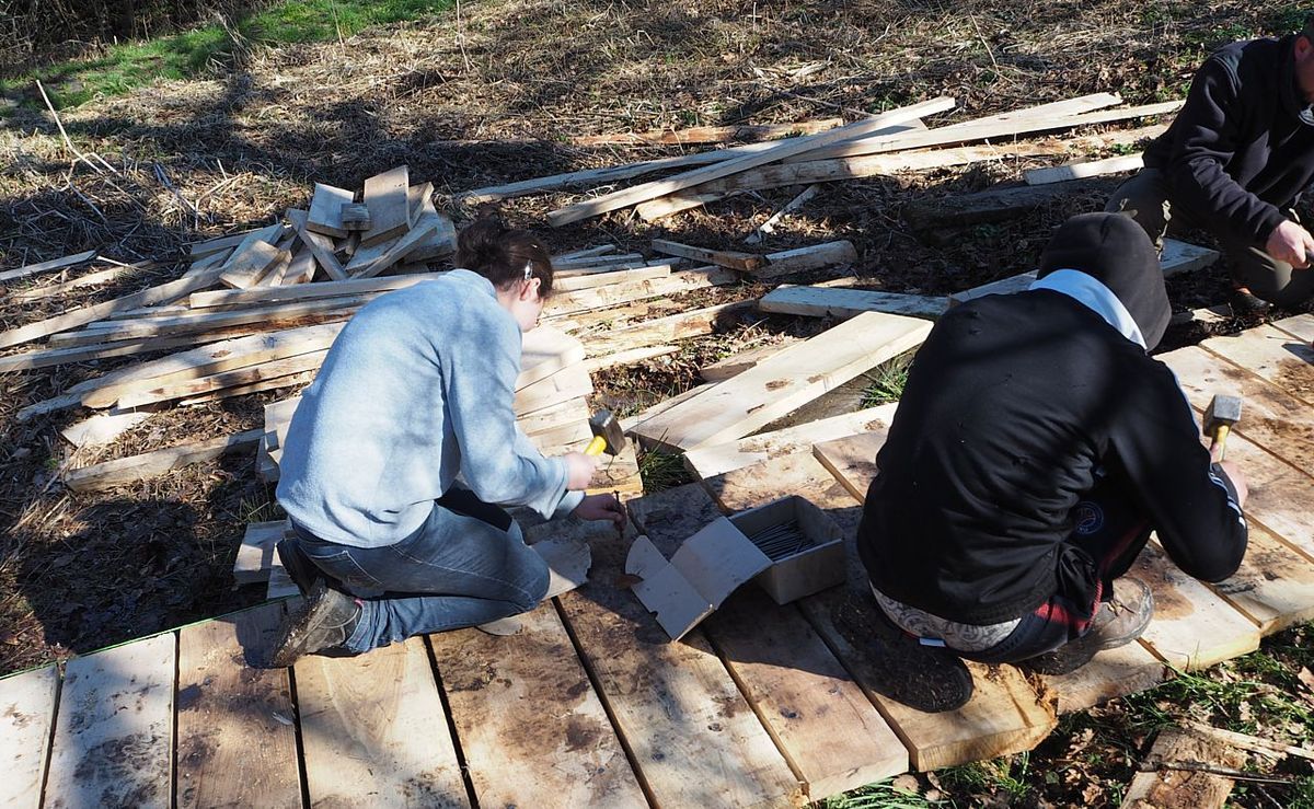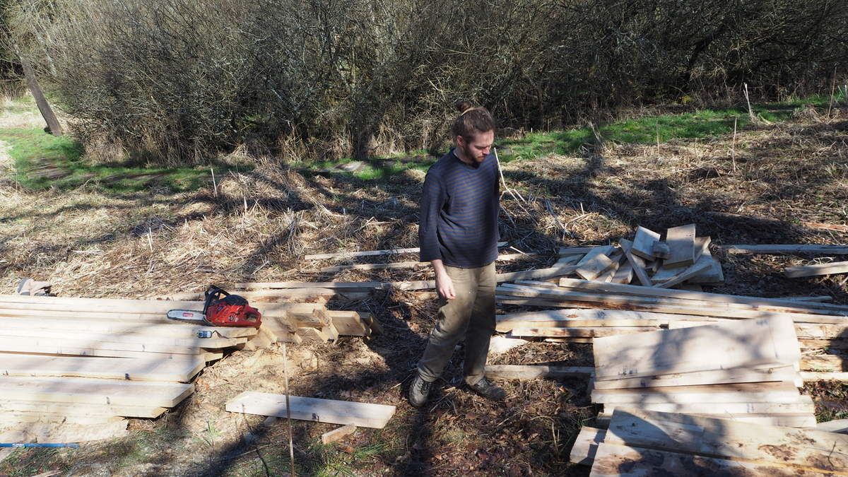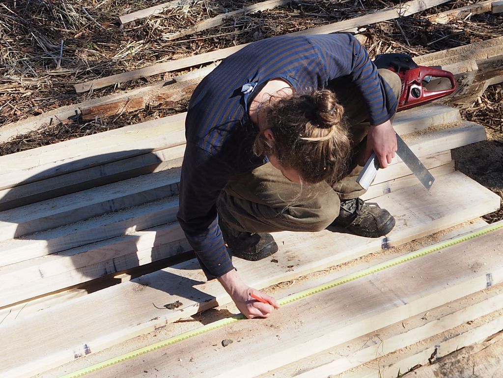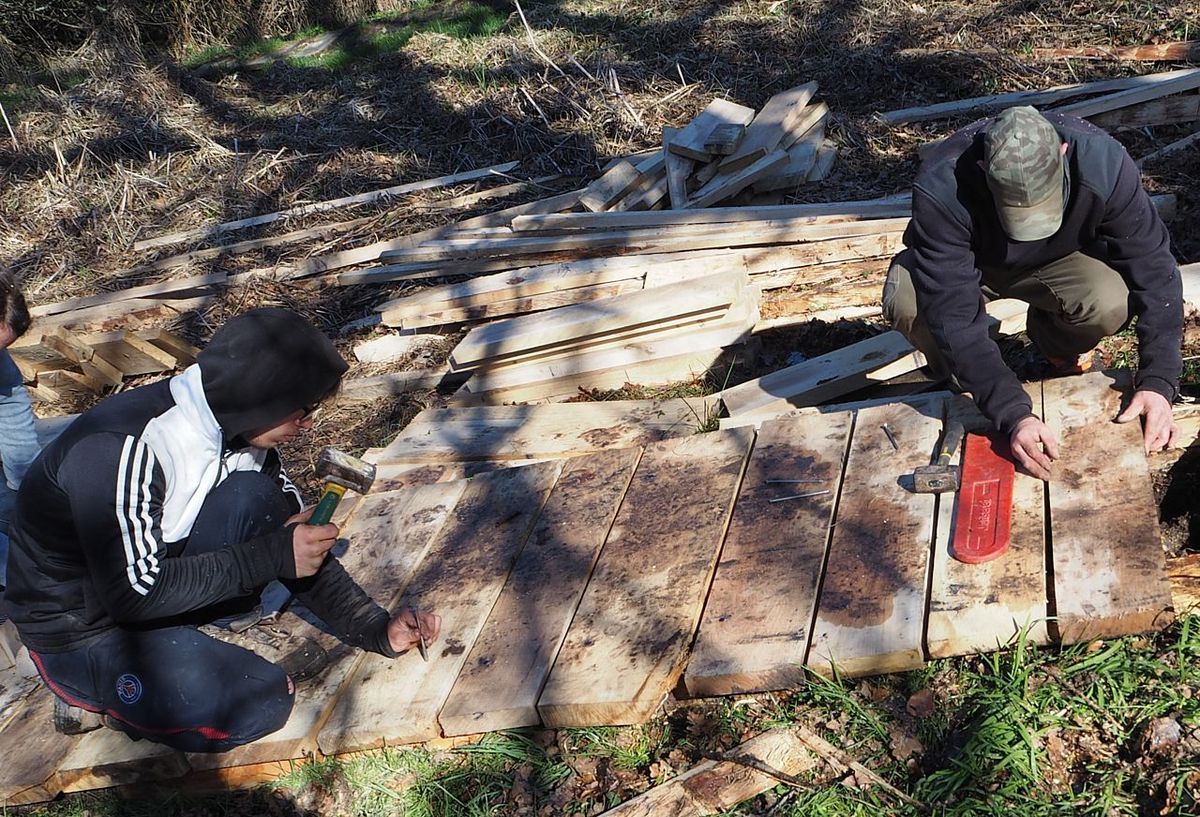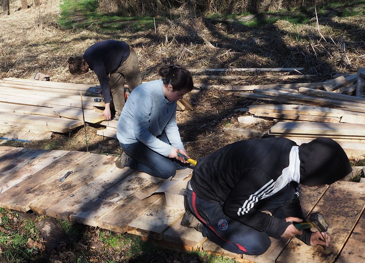 Cette semaine le chantier d'insertion refait à neuf toute une section. Un chêne abattu par les salariés a été débité en belles planches de 4 cm d'épaisseur. Elles serviront à remplacer les anciennes qui ont été ôtées.