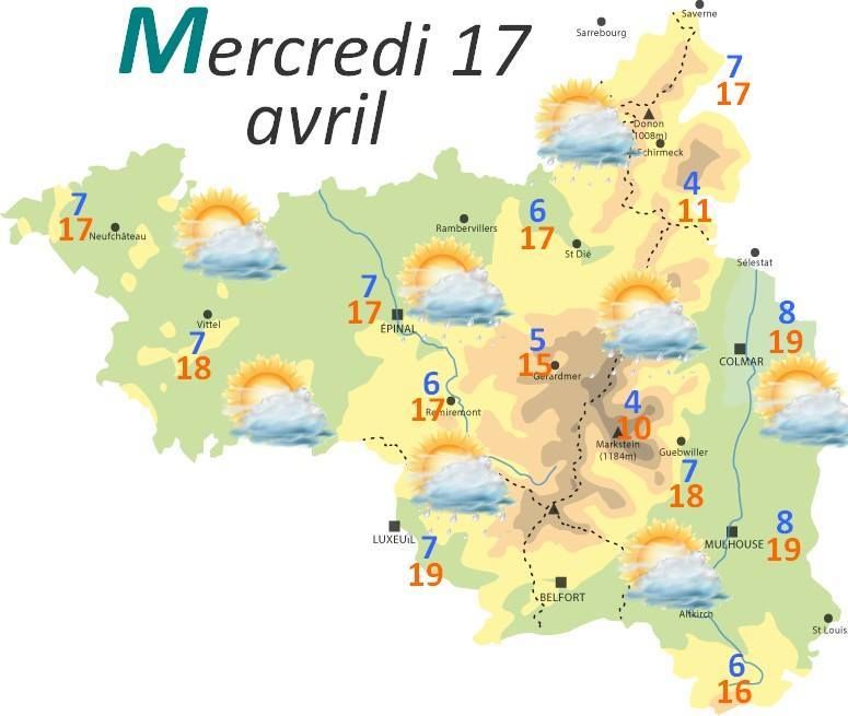 ► JEUDI : Superbe journée ensoleillée avec de rares nuages d'altitude. Comptez 5 à 9 °C du côté des minimales, 18 à 22 °C en plaine en journée.