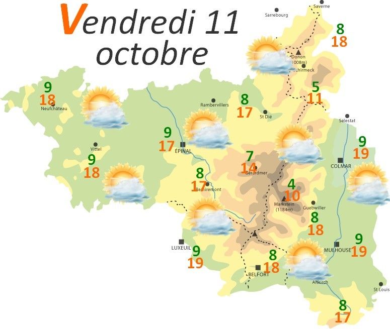 ► L'embellie se dessine déjà ce SOIR avec des éclaircies beaucoup plus nombreuses et un retour au sec. Elle se confirme demain vendredi qui sera une belle journée généralement bien ensoleillée après dissipation de brouillards matinaux. Les températures maximales seront en hausse pour se hisser à une moyenne de 16 à 19 °C en plaine.