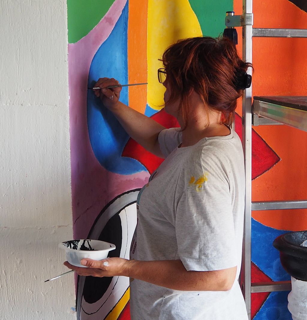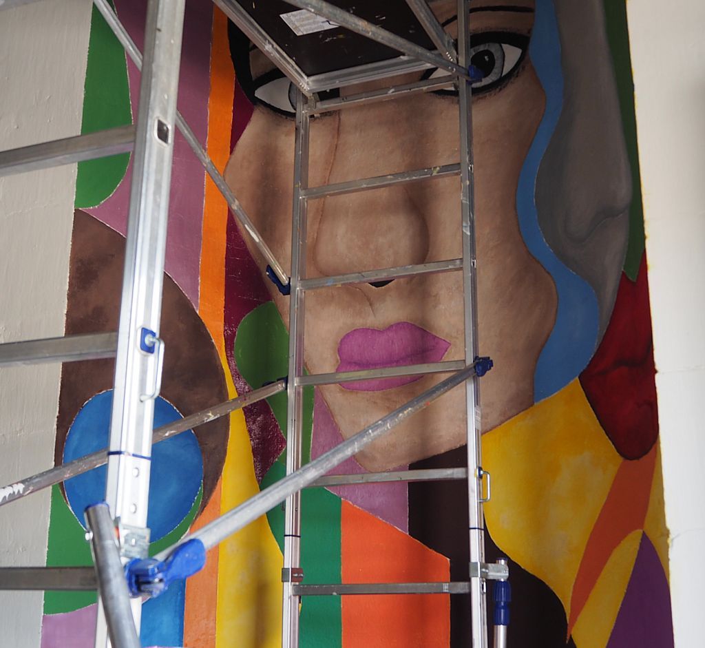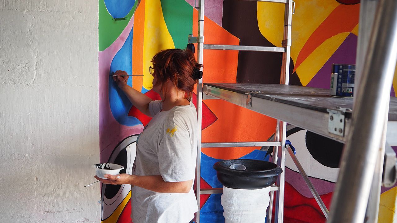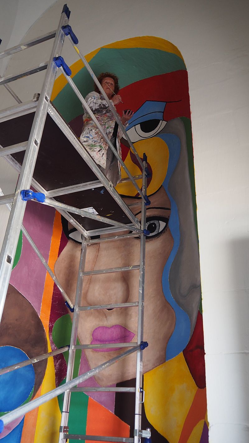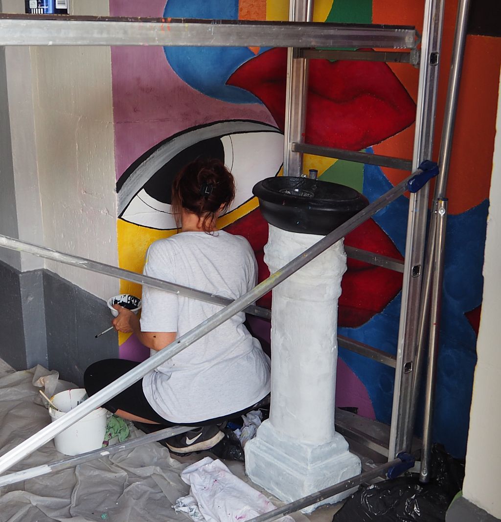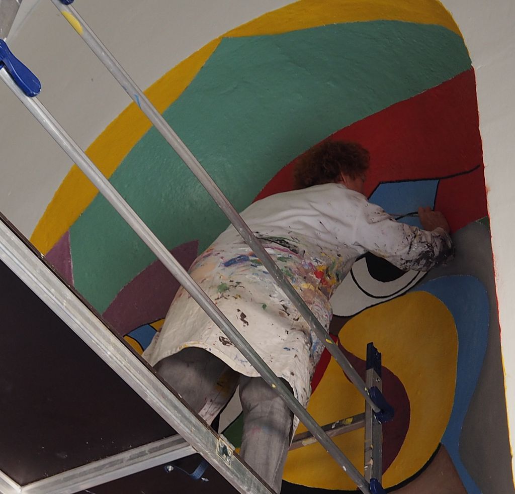 Couche après couche les teintes de la deuxième fresque se font plus vives. Les artistes vont en mettre trois pour donner du relief. Au départ une couche d'enduit à l'ancienne à base de chaux a été appliquée sur le mur par un maçon. De ce côté ci il est beaucoup plus irrégulier que de l'autre ce qui complique la réalisation de la fresque.